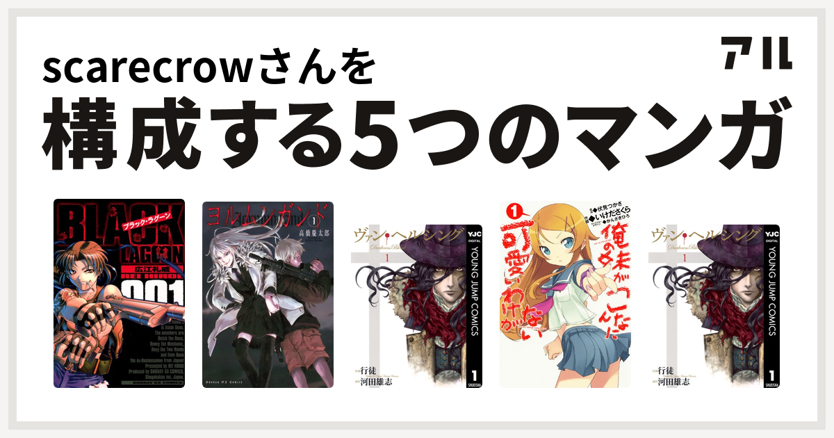 Scarecrowさんを構成するマンガはブラック ラグーン ヨルムンガンド ヴァン ヘルシング Darkness Blood 俺の妹がこんなに可愛いわけがない ヴァン ヘルシング Darkness Blood 私を構成する5つのマンガ アル