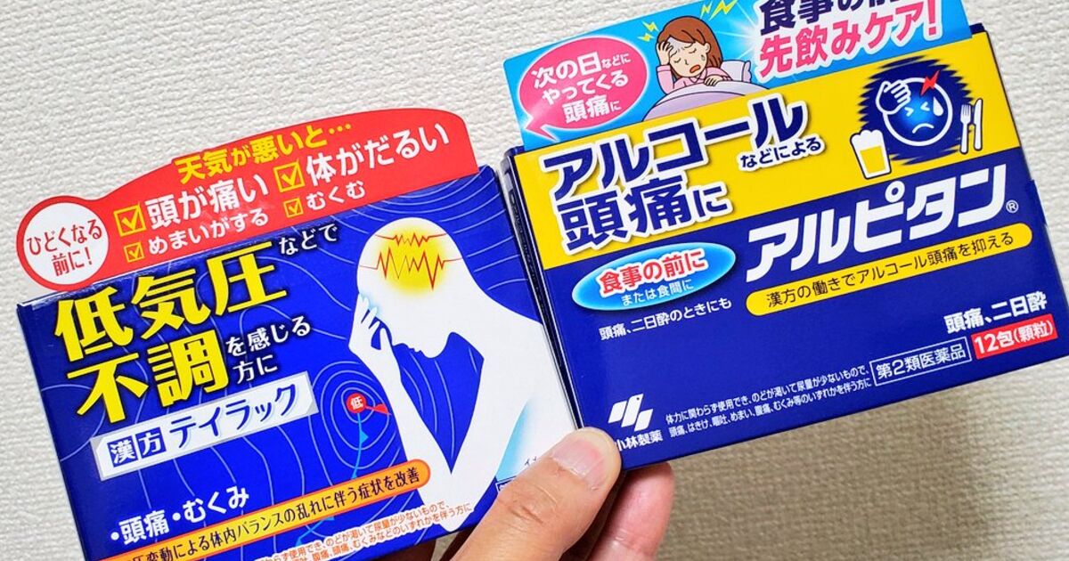 低気圧などで不調を感じる方に アルコールなどによる頭痛に とパッケージに書かれた漢方薬 どちらも同じ 五苓散 だった Togetter