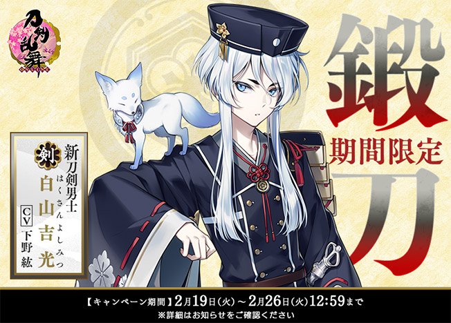 刀剣乱舞 Online 運営 Auf Twitter 新刀剣男士 期間限定鍛刀キャンペーン開催 本日2月19日 火 メンテナンス終了後から2月26日 火 12時59分まで 期間限定鍛刀キャンペーンを開催いたします 今回は新刀剣男士 白山吉光 はくさんよしみつ が鍛刀に登場です