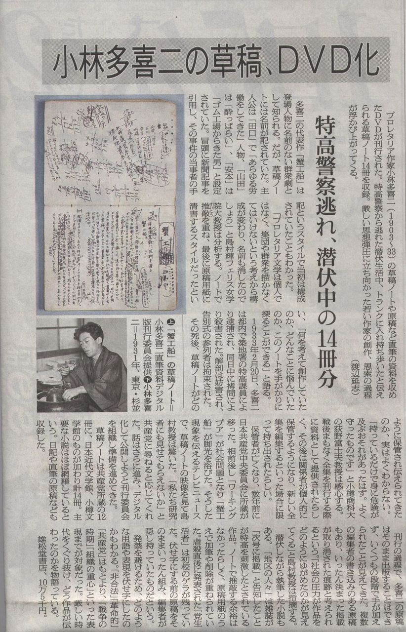 本日付 朝日 夕刊 小林多喜二の草稿 dvd化 特高警察逃れて潜伏中の14冊分 Prof Shima S Life And Opinion
