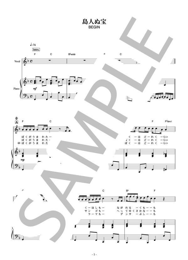 楽譜 島人ぬ宝 Begin ピアノ 弾き語り 中級 ぷりんと楽譜