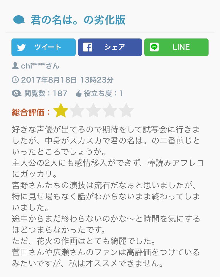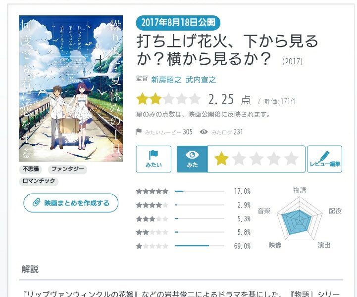 酷評で荒れる 打ち上げ花火 下から見るか 横から見るか の思わず観たくなる感想を述べるレビュアー現る 考察が楽しいシャフトの文学作品 君の名は 感覚で見てはいけない Togetter